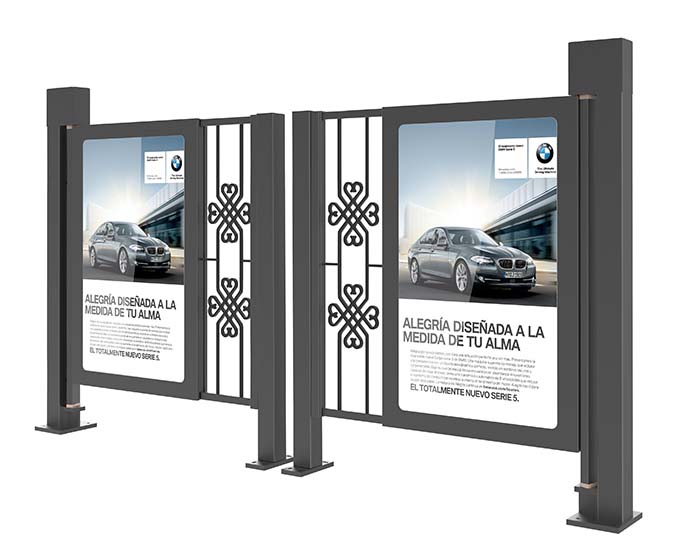 傳統的鐵門上加上獨特的燈條,使夜間展現一種獨特的燈光效果,給小區門口一中高端大氣的感覺,同時也為廣告信息傳播提供了更加豐富的選擇,增加了物業和廣告主之間的信息橋梁,是小區設施的首要選擇。