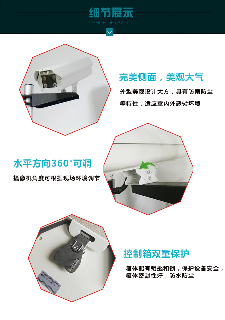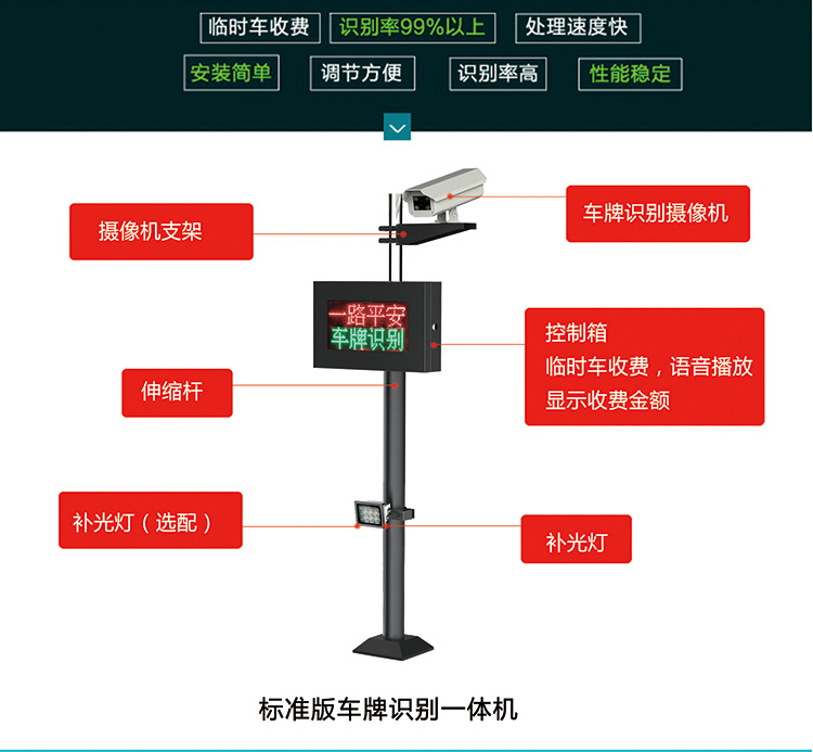 該產品集成了車牌識別相機、鏡頭防護罩、立柱、補光燈等設備,具有集成度高、安裝方便、使用成本低等特點。